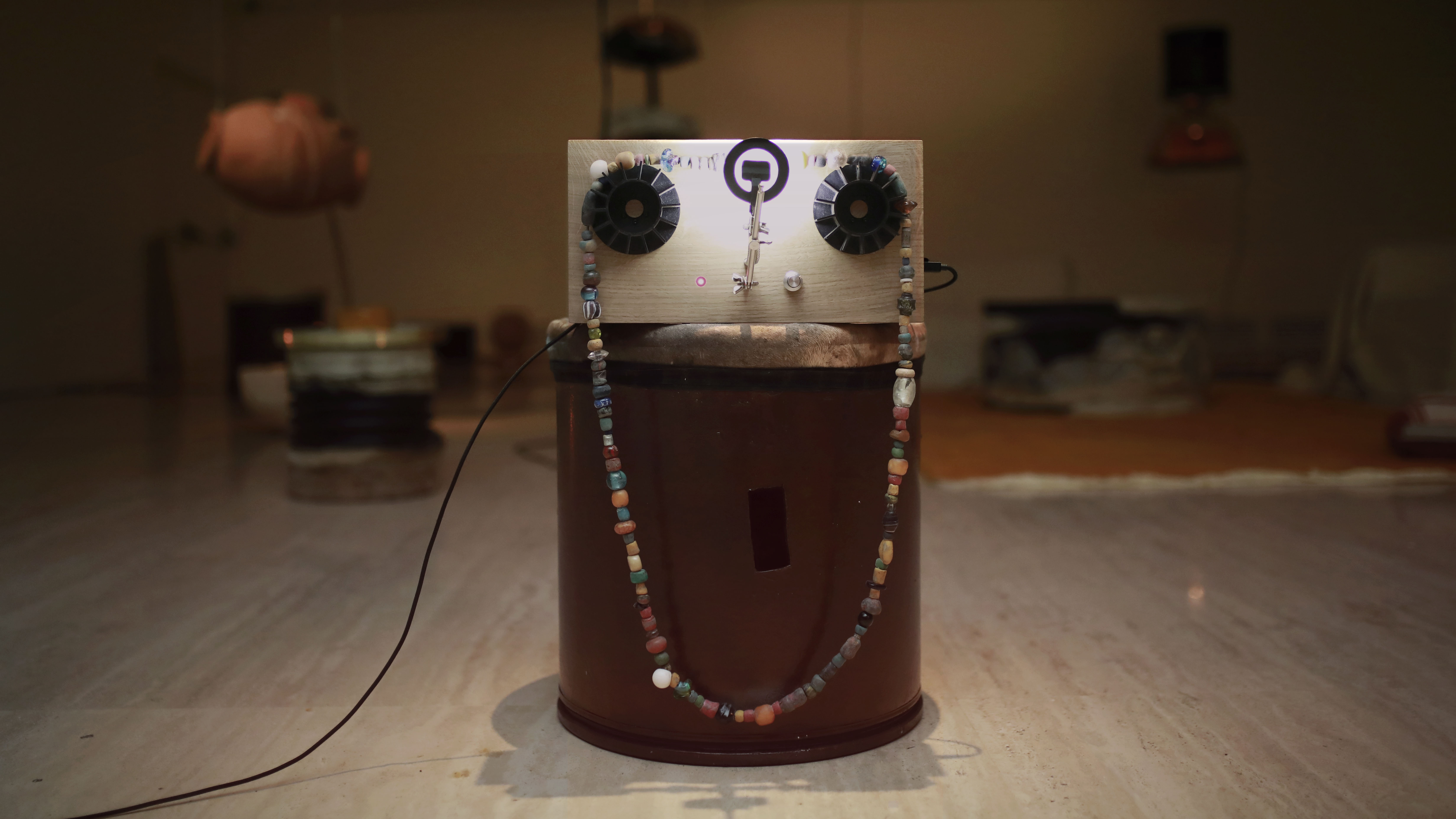 These sonic salons—of which five were created and three acquired by TBA21—are conceived as spaces for collective listening and poetic hospitality. Here, audiences are not mere observers, but participants in a dynamic listening encounter. Speakers nested within hand-crafted cushions, drums, and earthenware generate immersive soundscapes drawn from Atoui’s collaborative compositions, inviting reflection on displacement, intimacy, and the politics of welcome.