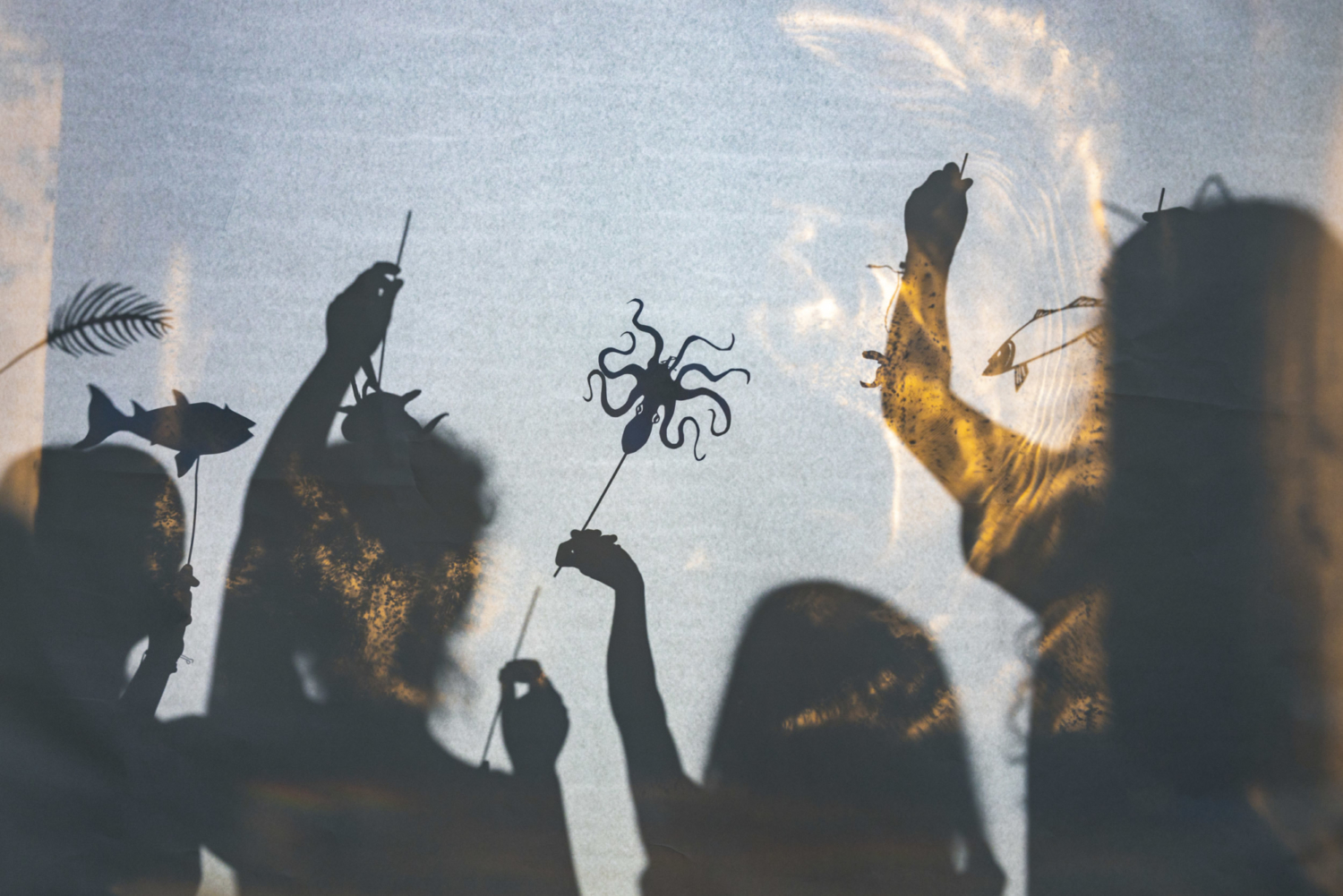 Silhouettes of several people holding up shadow puppets shaped like sea creatures and plants against a softly lit background.
