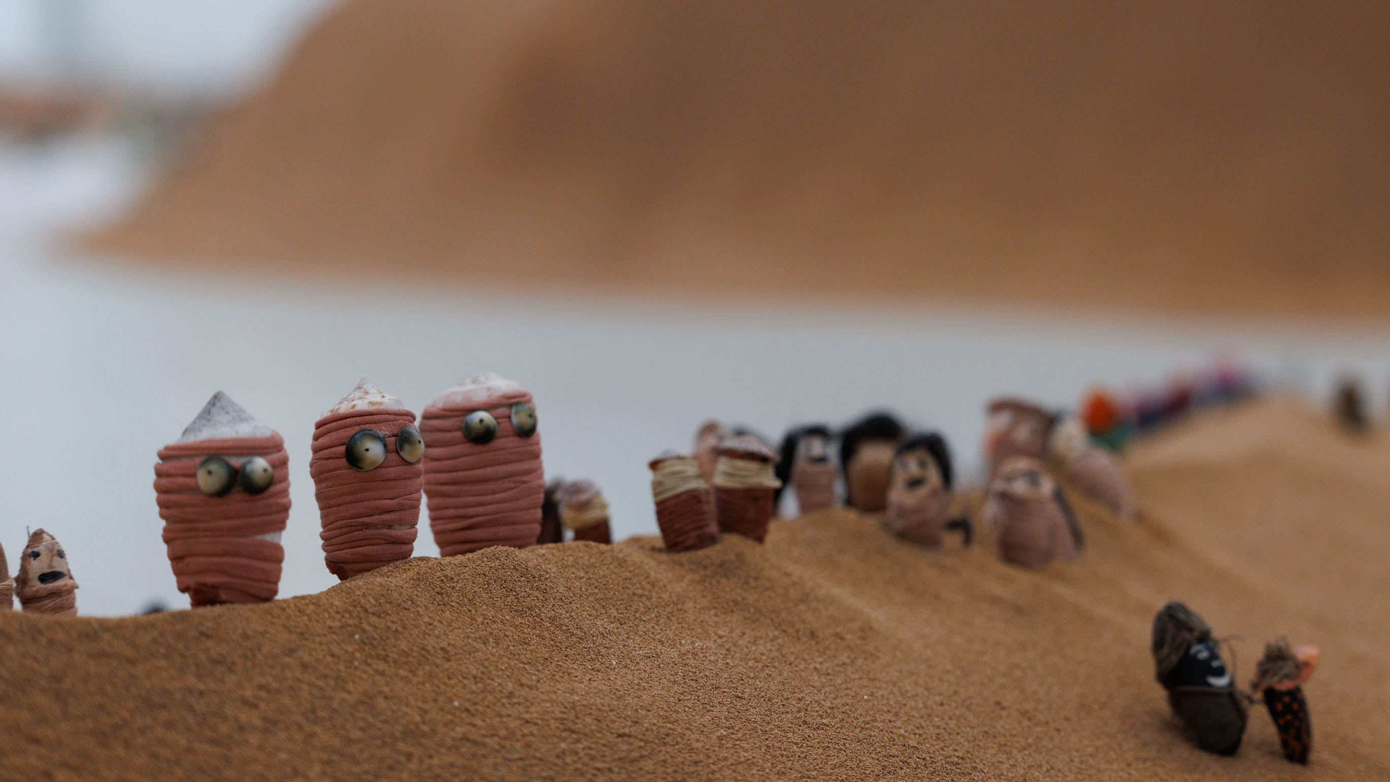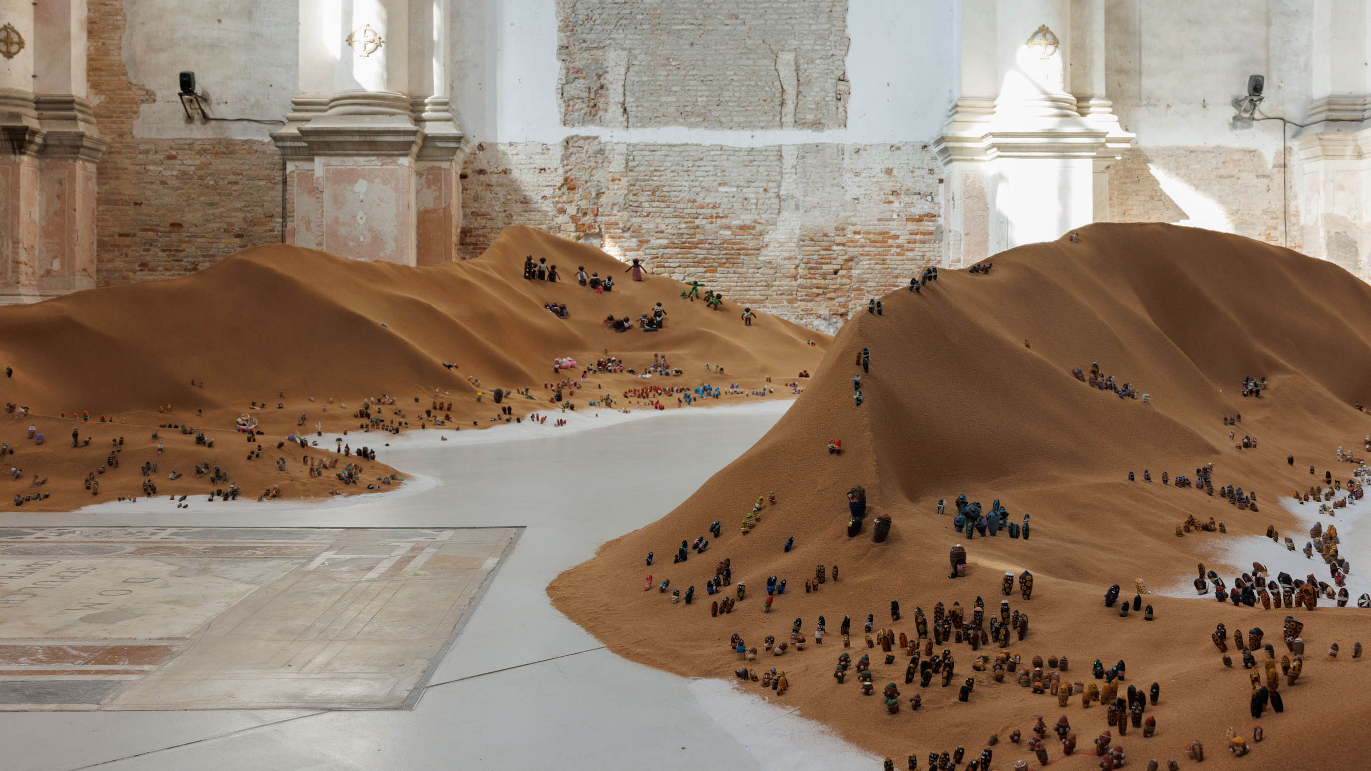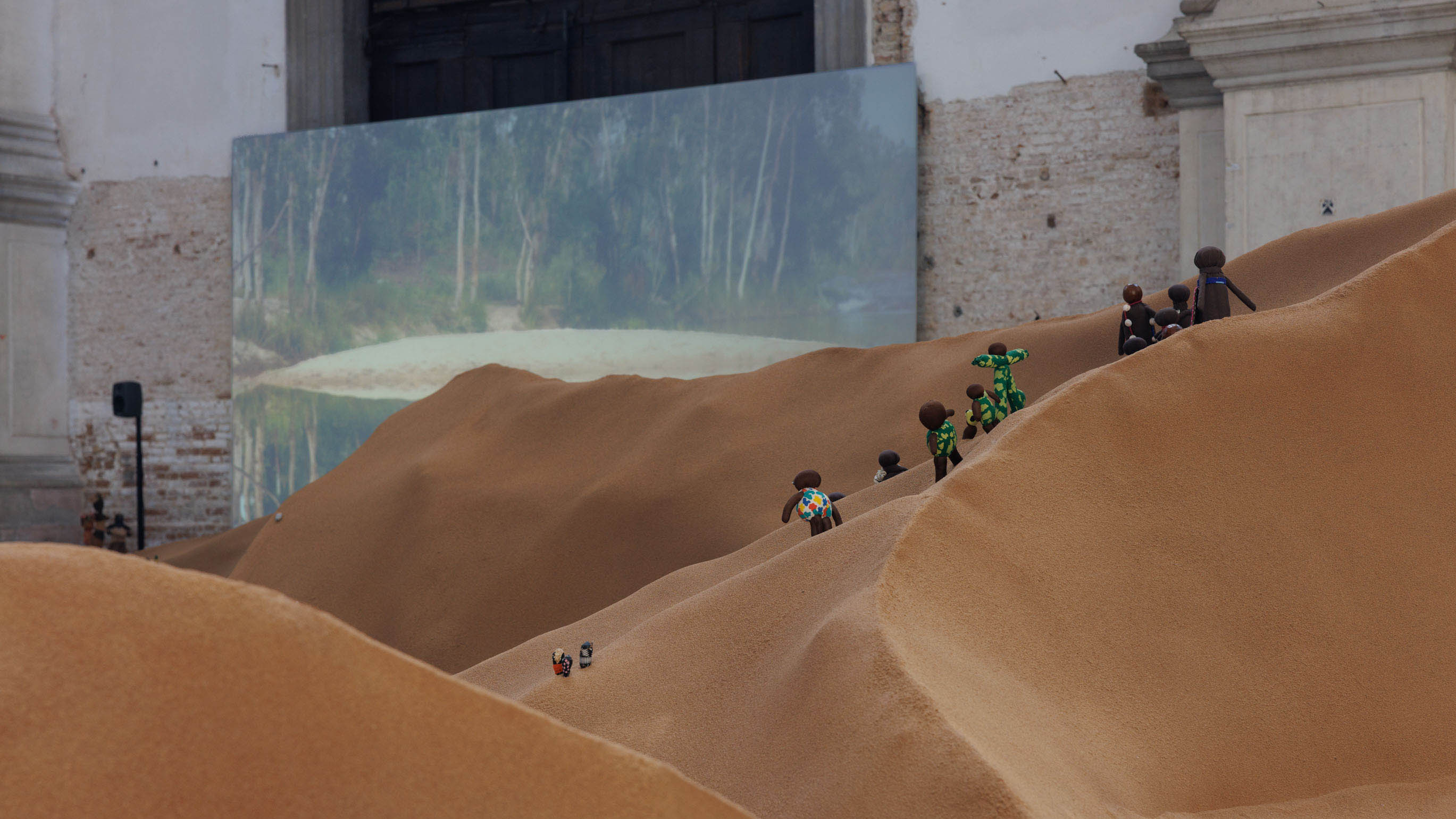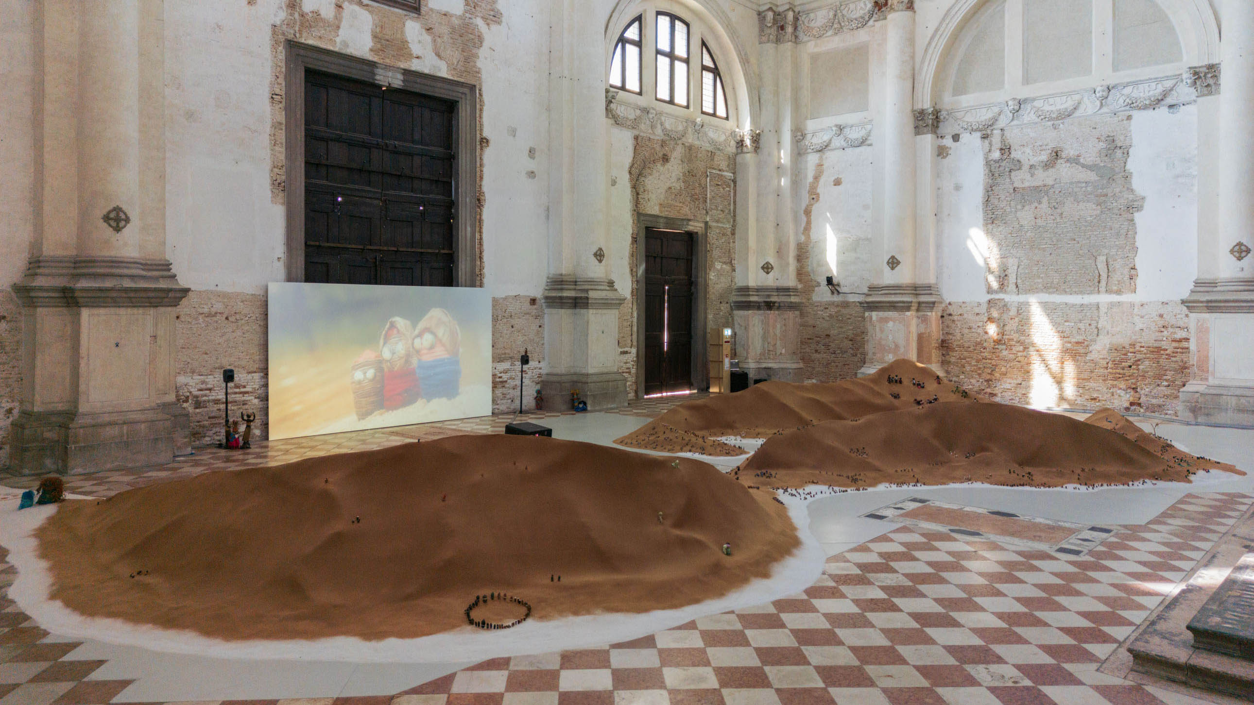 The exhibition sees both wings of the former Church of San Lorenzo come alive with newly commissioned multimedia works. In the west wing, the Repatriates Collective welcomes viewers into an immersive installation combining sand, thousands of characters made of shell and textile, video and sound. This exhibition is more than an artistic expression; it is a ceremonial act of reclamation. It is a form of homecoming that moves beyond activism, offering a more profound form of resistance. Without abrasive rhetoric or jargon it speaks with a gentleness, an unfolding, a softness—a poetic articulation of cultural survival. The stories told here are shaped by the language of the land, the sea, and the bodies that create them. This is also a portrait of possible relations between humans and the sea, and the ways in which communities teach their children about those relations, using sculptures made of shells, through stories of their families, practices, ancestors. Sand from Noeleen Lalara’s land anchors the work, with a vast dune transformed into a living landscape of totems, clans, and songlines. Indigenous dolls made at the Anindilyakwa art center and Laimi Kakololo become a chorus of ancestral messengers, acting as vessels of memory and continuity. These characters are brought to life in film and the installation is saturated in songs that carry wisdom across water, bridging two communities across continents, in a sound composition by Rebekah Wilson.