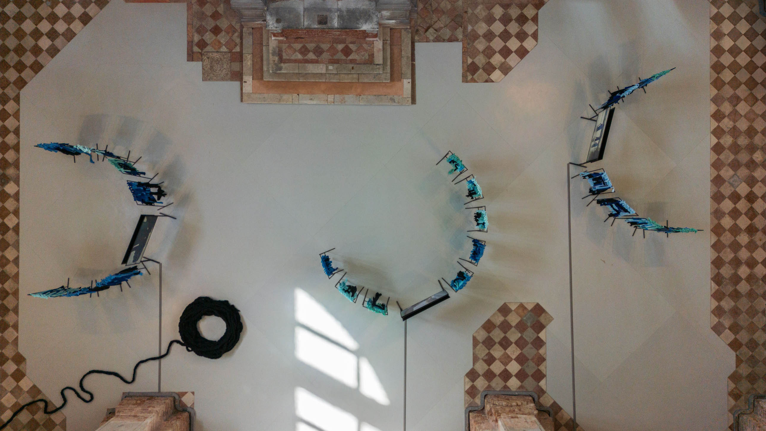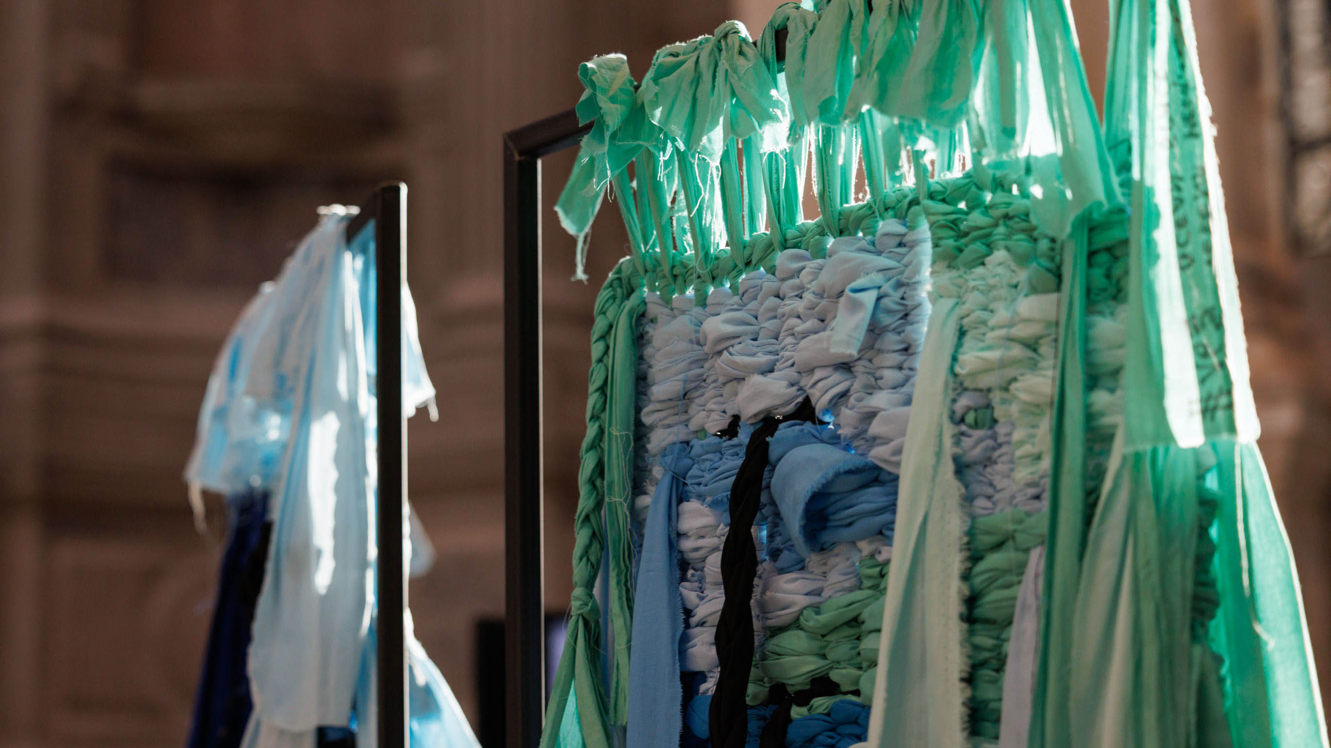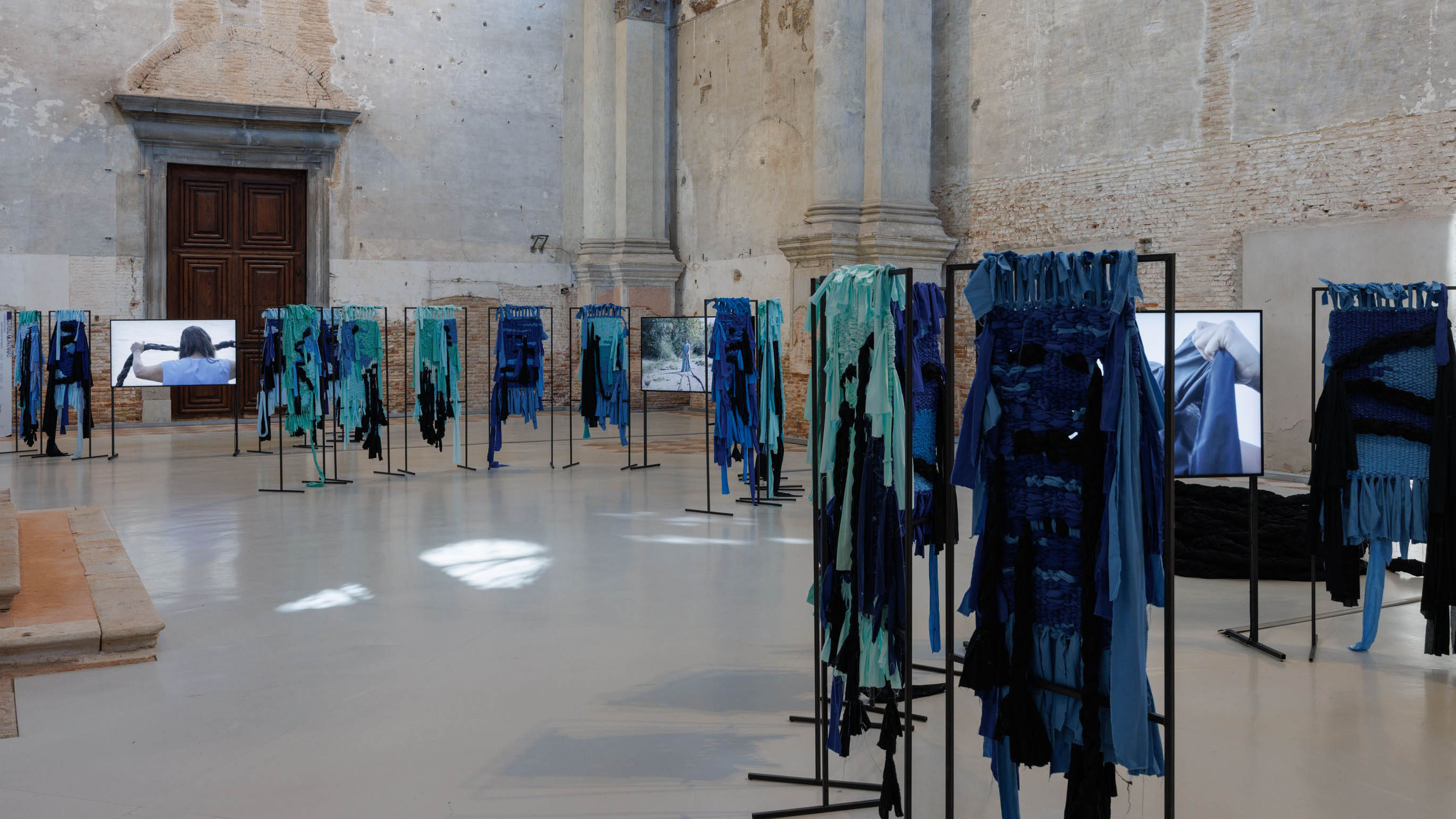 In the east wing, a textile–video installation by Verena Melgarejo Weinandt traces gestures of care, belonging, and collective healing. Woven, blue-toned fabrics occupy the space, threaded with black braids that recall both flowing water and strands of hair. Embedded within the textile landscape, a three-channel video follows a performance of preparing, braiding, and washing textiles in a river. Through this cyclical act—hands weaving, water cleansing—the work meditates on the continuity of bodies of water, where rivers become oceans. The intertwining of hair and current evokes ancestral memory, with water carrying histories of care and resilience.